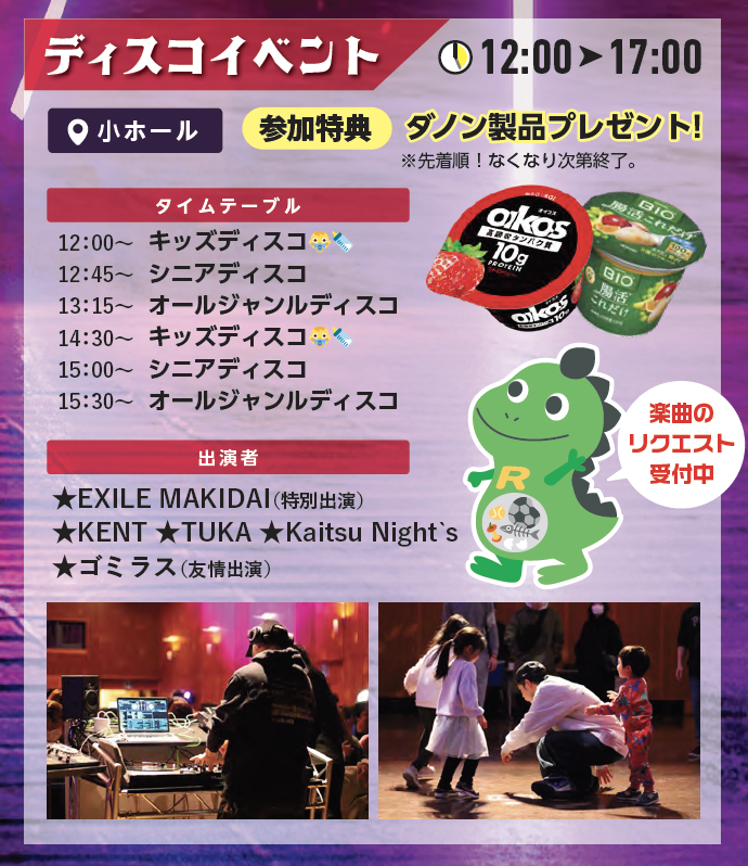 時間帯別にキッズ向け、シニア向けなどテーマを分けて選曲した曲をかけます。ミラーボールが回る空間で音楽に合わせて自由に体を動かしてお楽しみください!保育園での環境学習でお馴染みのゴミラスも遊びに来ます。リクエスト曲の事前募集を行っています。事前のお申し込みは不要ですので、当日会場にお越しください。。