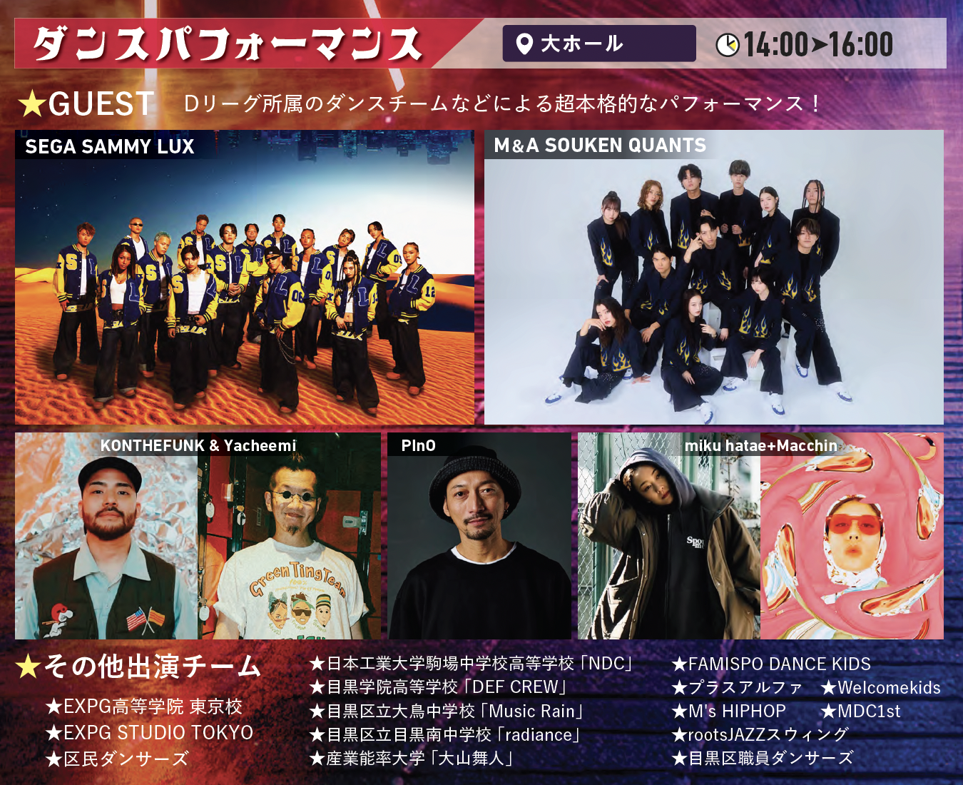 めぐろパーシモンホールで実施する目黒区主催のダンスイベント。目黒区にゆかりのある 株式会社LDH JAPANの全面協力のもと、大ホール、小ホール、屋外スペースを利用し、様々なコンテンツで、子どもから大人まで楽しめるイベント!
